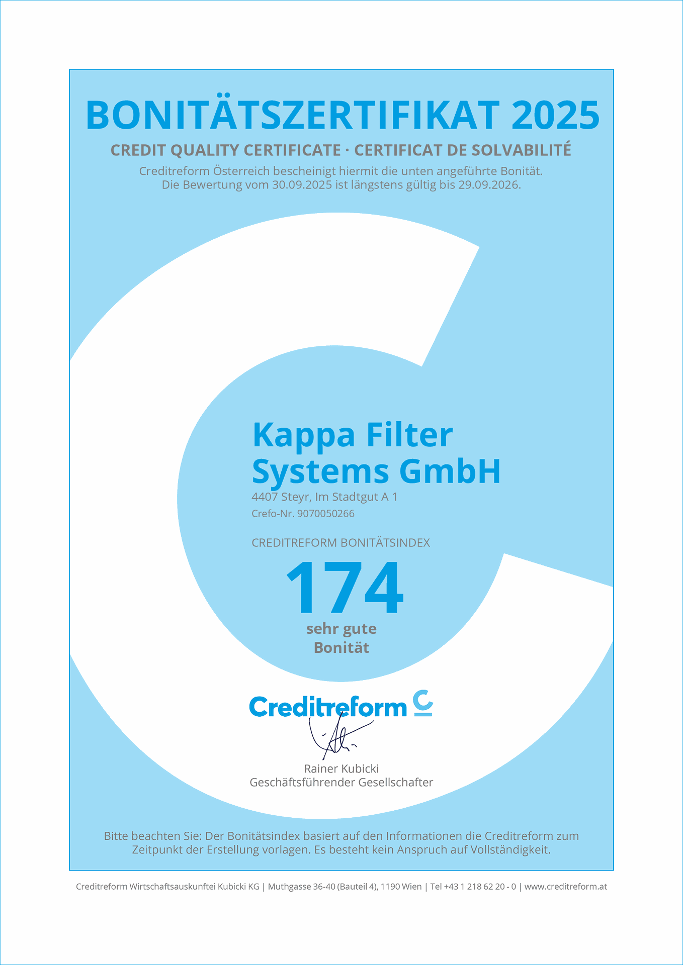 Die Informationen dieser Webseite werden von Kappa Filter Systems GmbH sorgfältig geprüft und regelmäßig aktualisiert. Für unbeabsichtigte und zufällige Fehler ersucht Kappa Filter Systems GmbH um Nachsicht. Trotz der von Kappa Filter Systems GmbH aufgebrachten größtmöglichen Sorgfalt wird für die inhaltliche Richtigkeit und Vollständigkeit keine Gewähr geleistet. Informationen können sofort und ohne vorheriger Ankündigung geändert, entfernt oder ergänzt werden. Es kann keine Garantie für die Vollständigkeit, Richtigkeit, Aktualität und Verfügbarkeit gegeben werden.